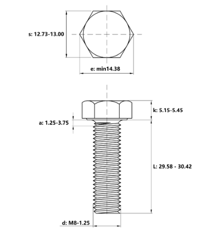 Tornillo de cabeza hexagonal de rosca completa M8 DIN933, acero inoxidable 304, longitud de 28mm con acabado liso, normas ISO y ASME